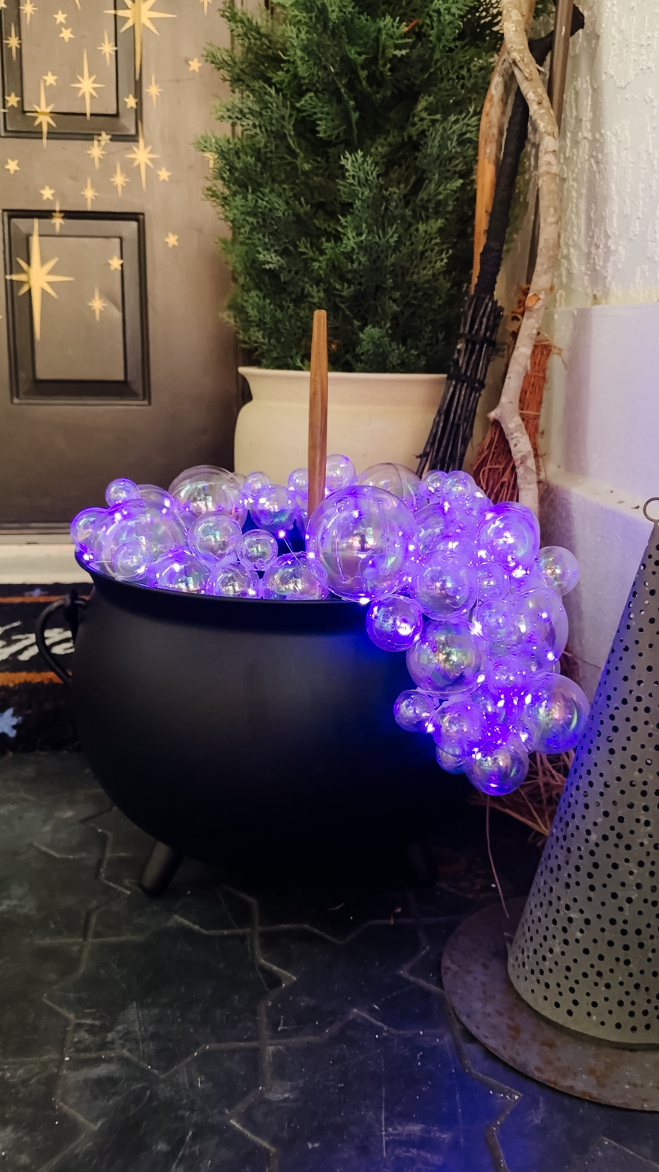 Tip: You can customize this DIY Witch Cauldron however you like by using clear ornaments for a more subtle look, changing up the light color, or even spray paint the cauldron to match your Halloween color palette.